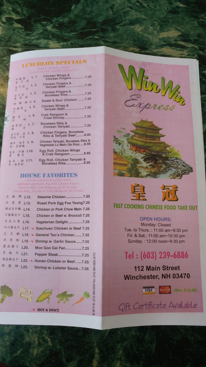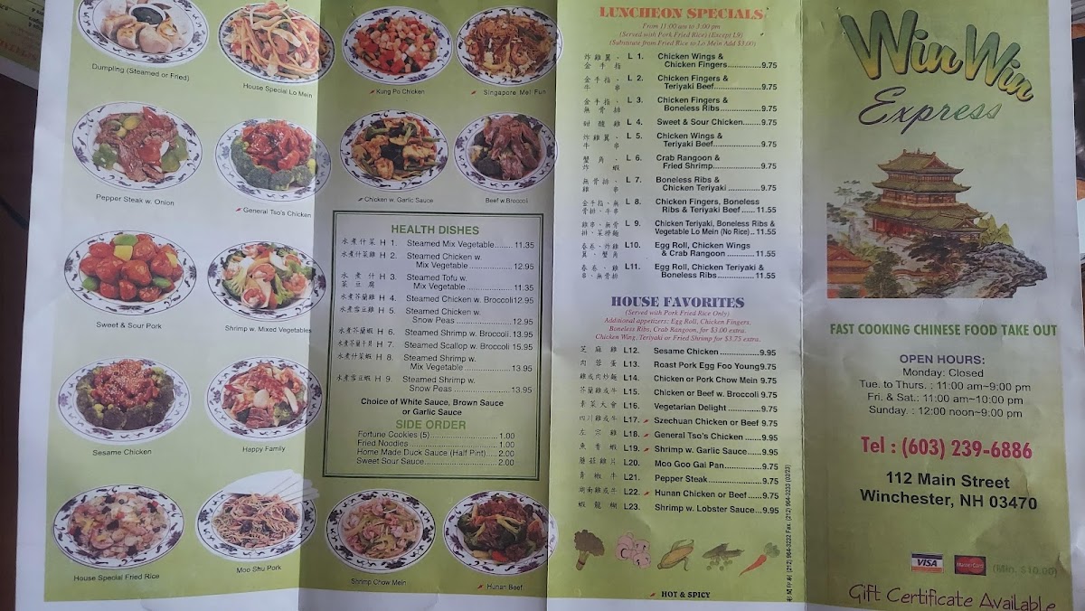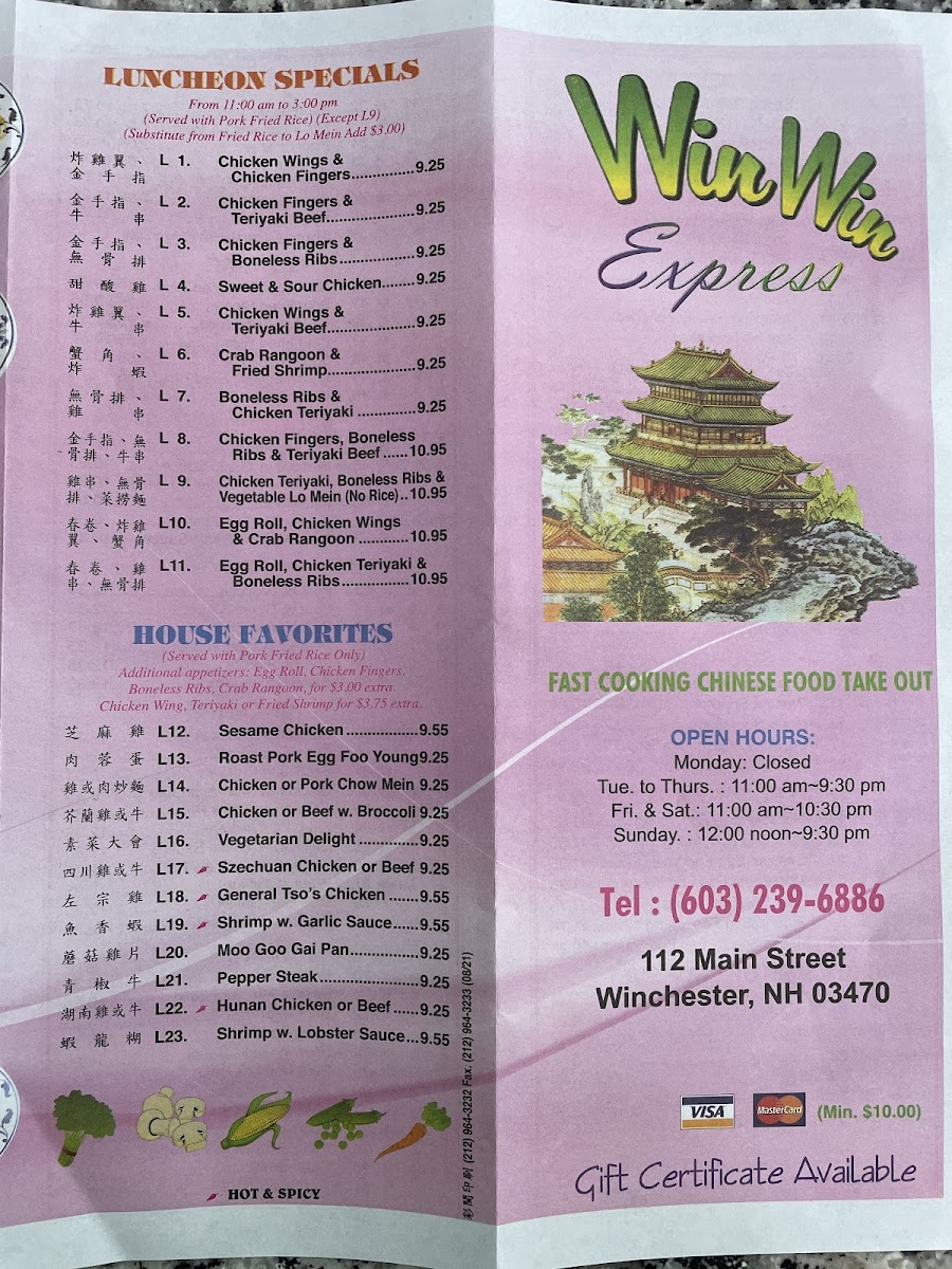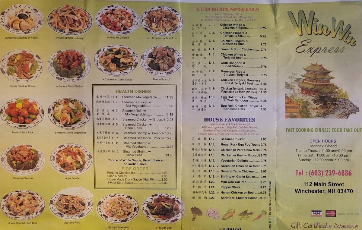 Welcome to Win Win Express, a delightful take-out haven located at 112 Main St, Winchester, NH. Renowned for its comforting and flavorful menu, this establishment has quickly become a local favorite.